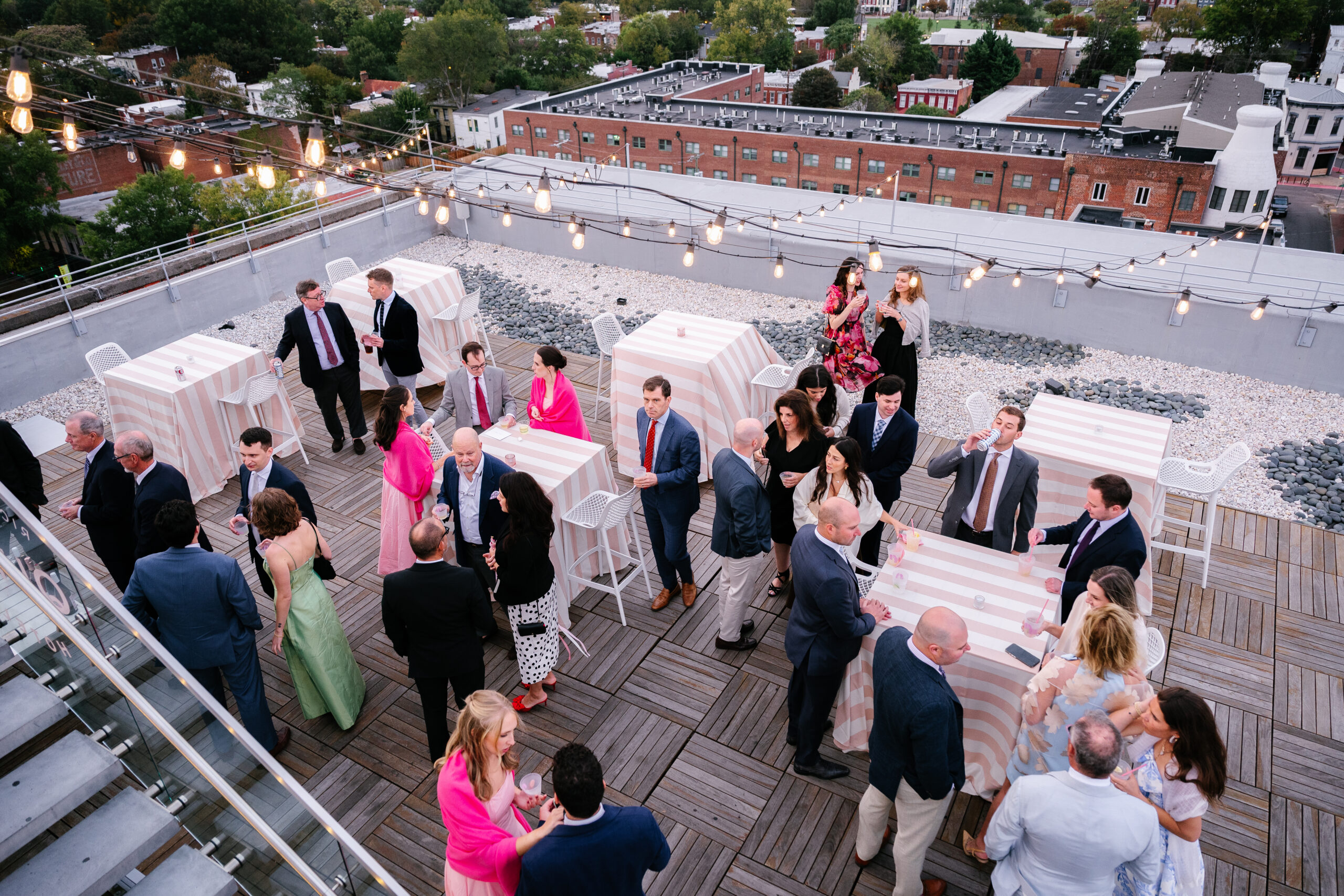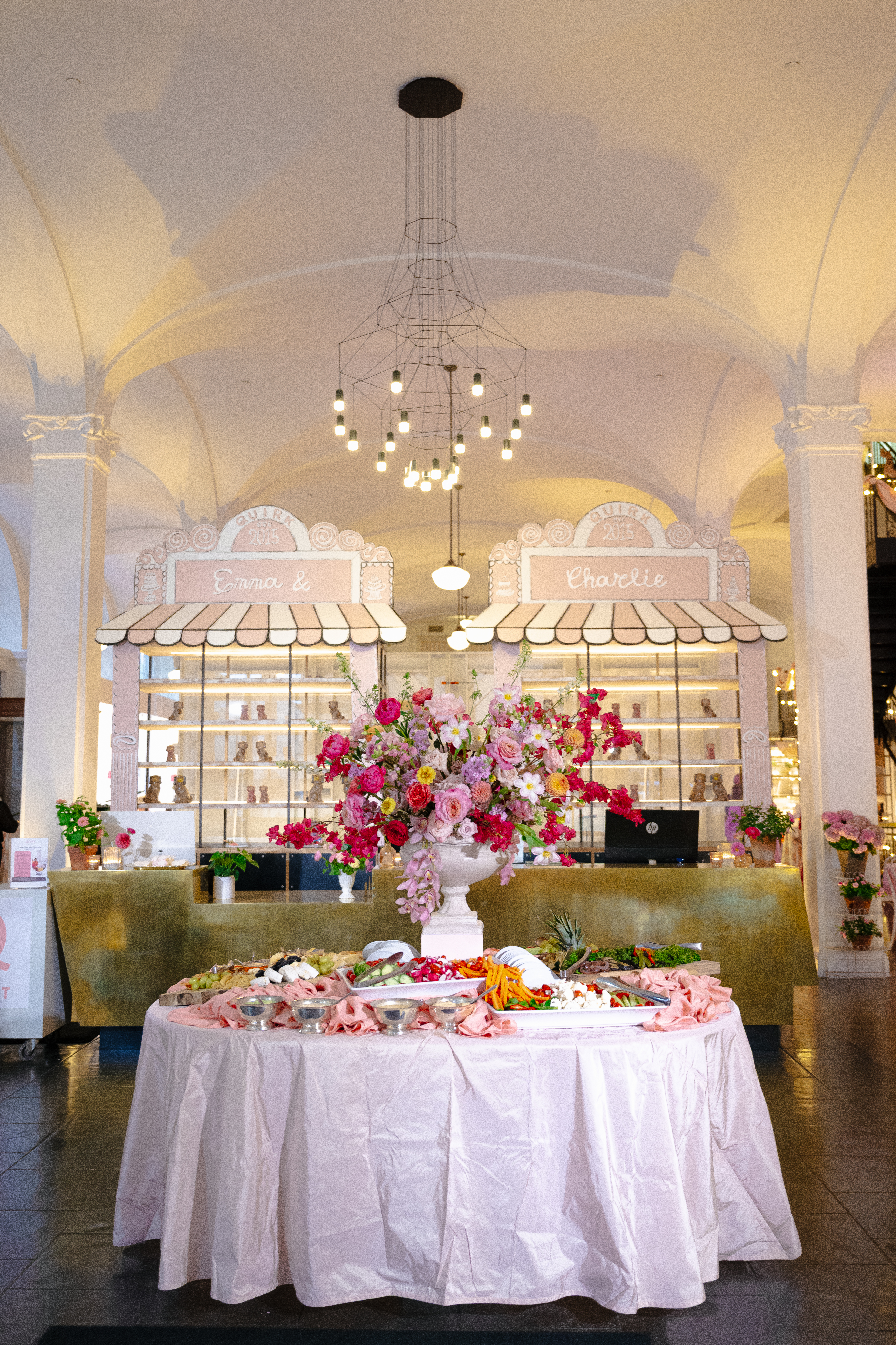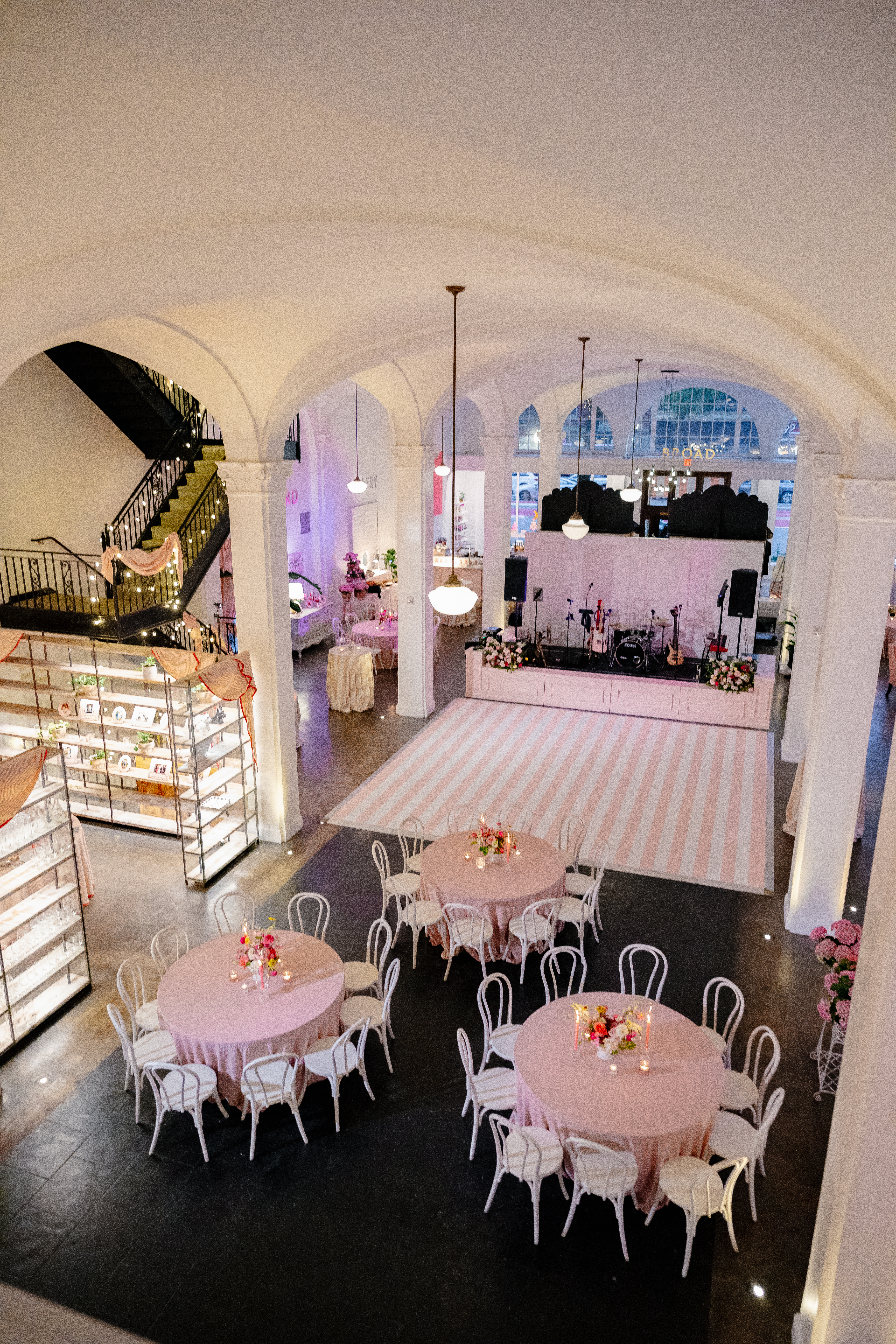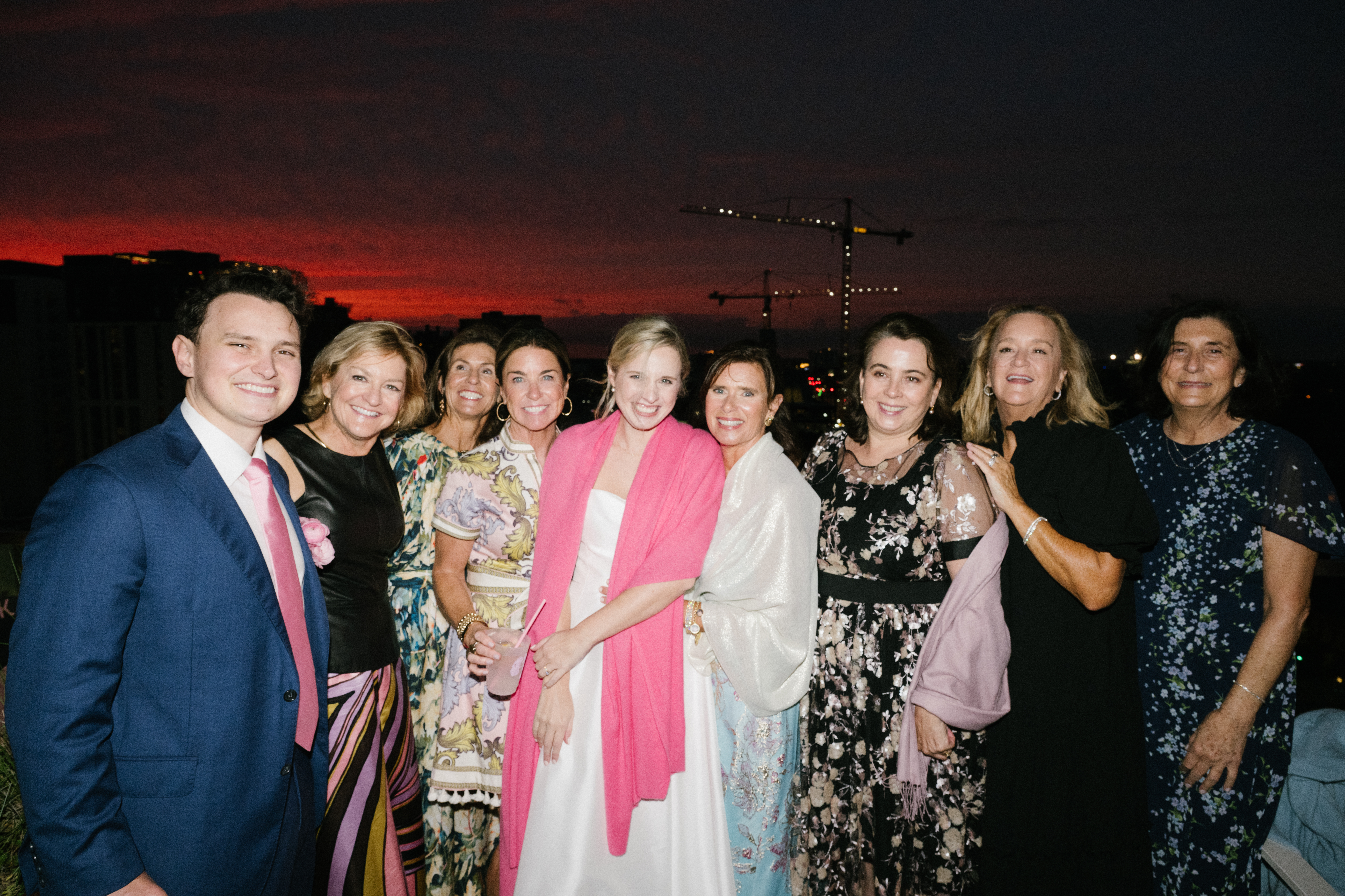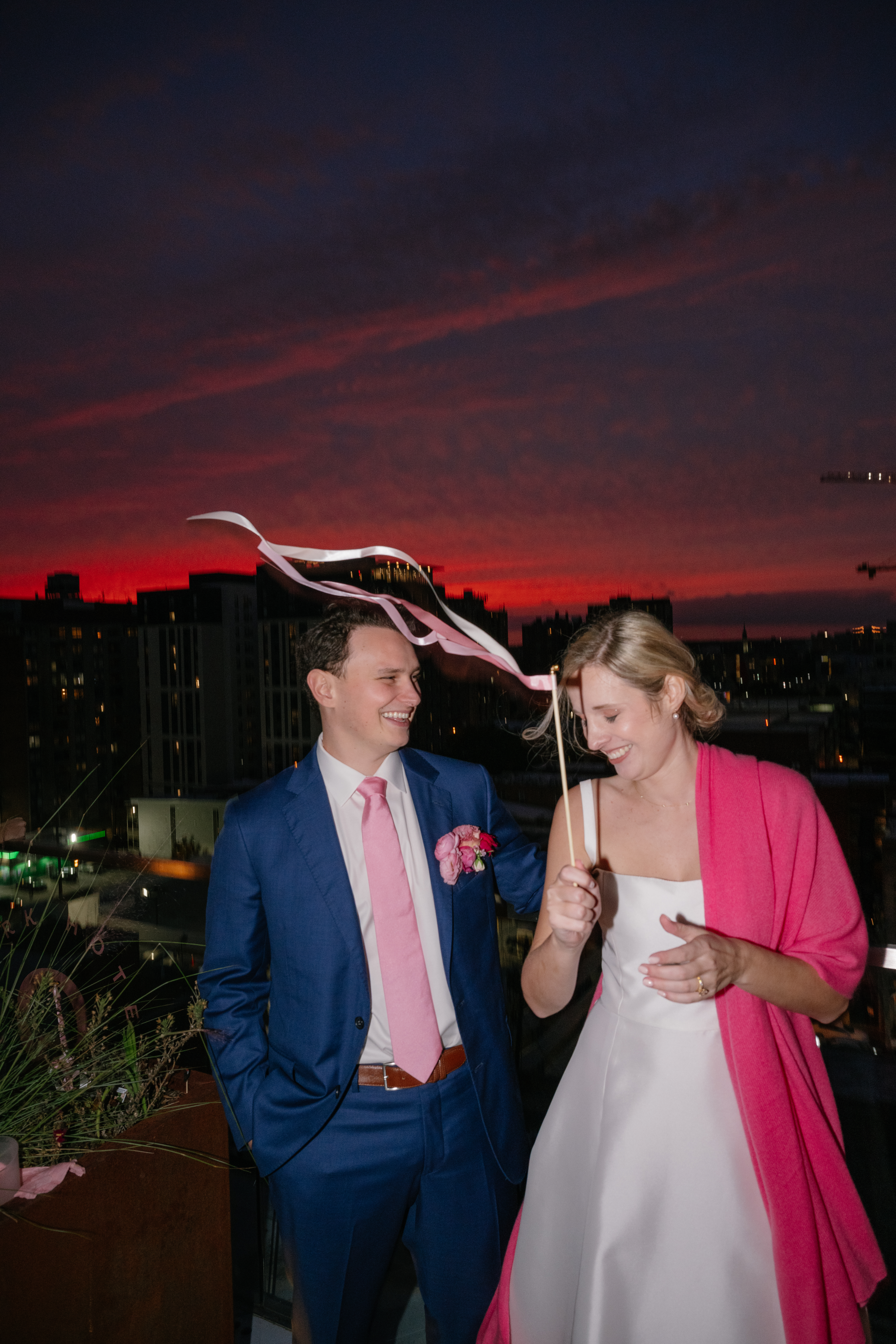 Emma’s vision centered on one priority: fun. From the moment guests stepped into the reception, it was clear this would be a party to remember. A pink striped dance floor set the tone, while thoughtful details, like custom cups featuring Max and Odie, added personality and charm. During cocktail hour, guests were treated to a breathtaking pink sunset on the rooftop, a serendipitous backdrop that felt almost too perfect to plan.