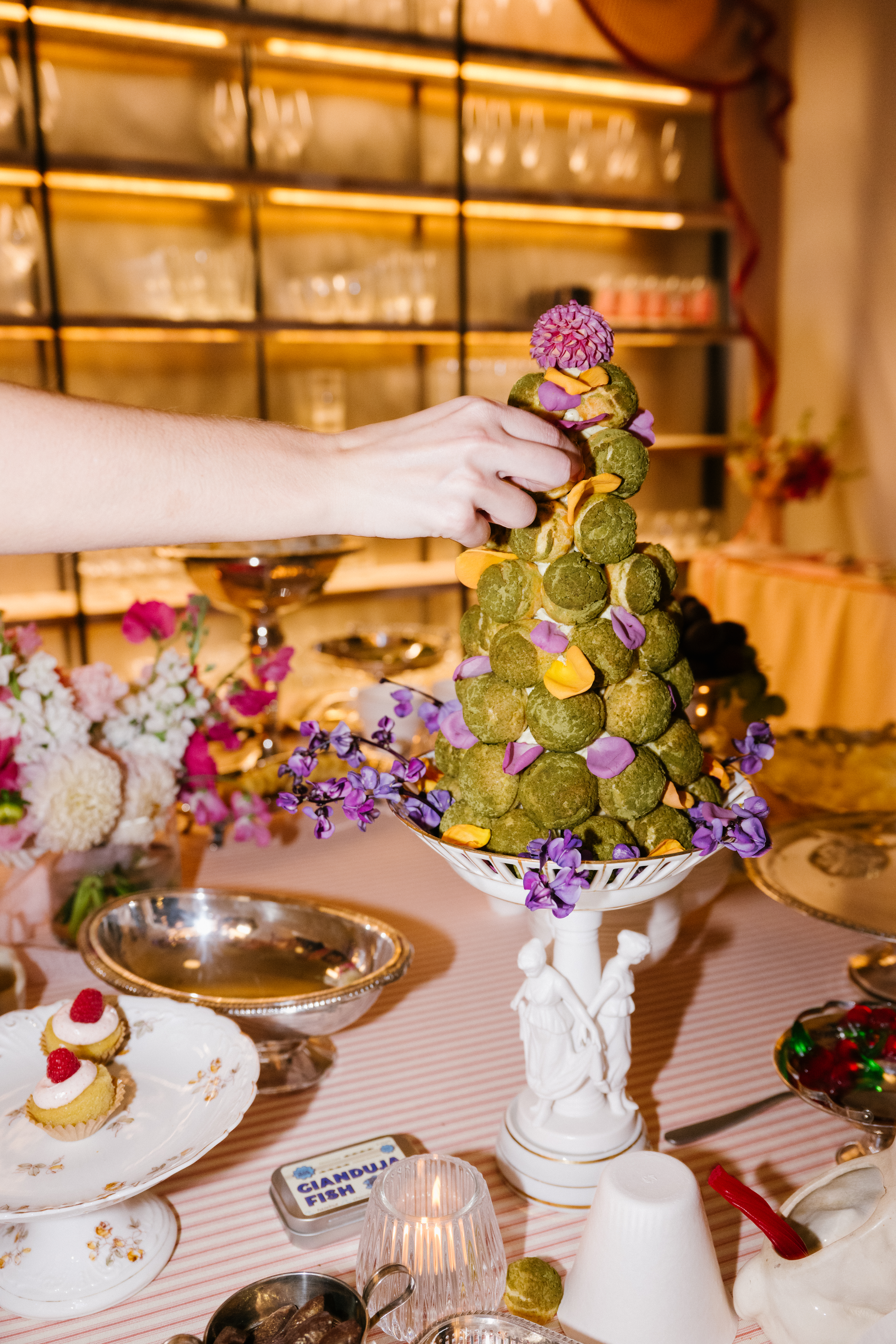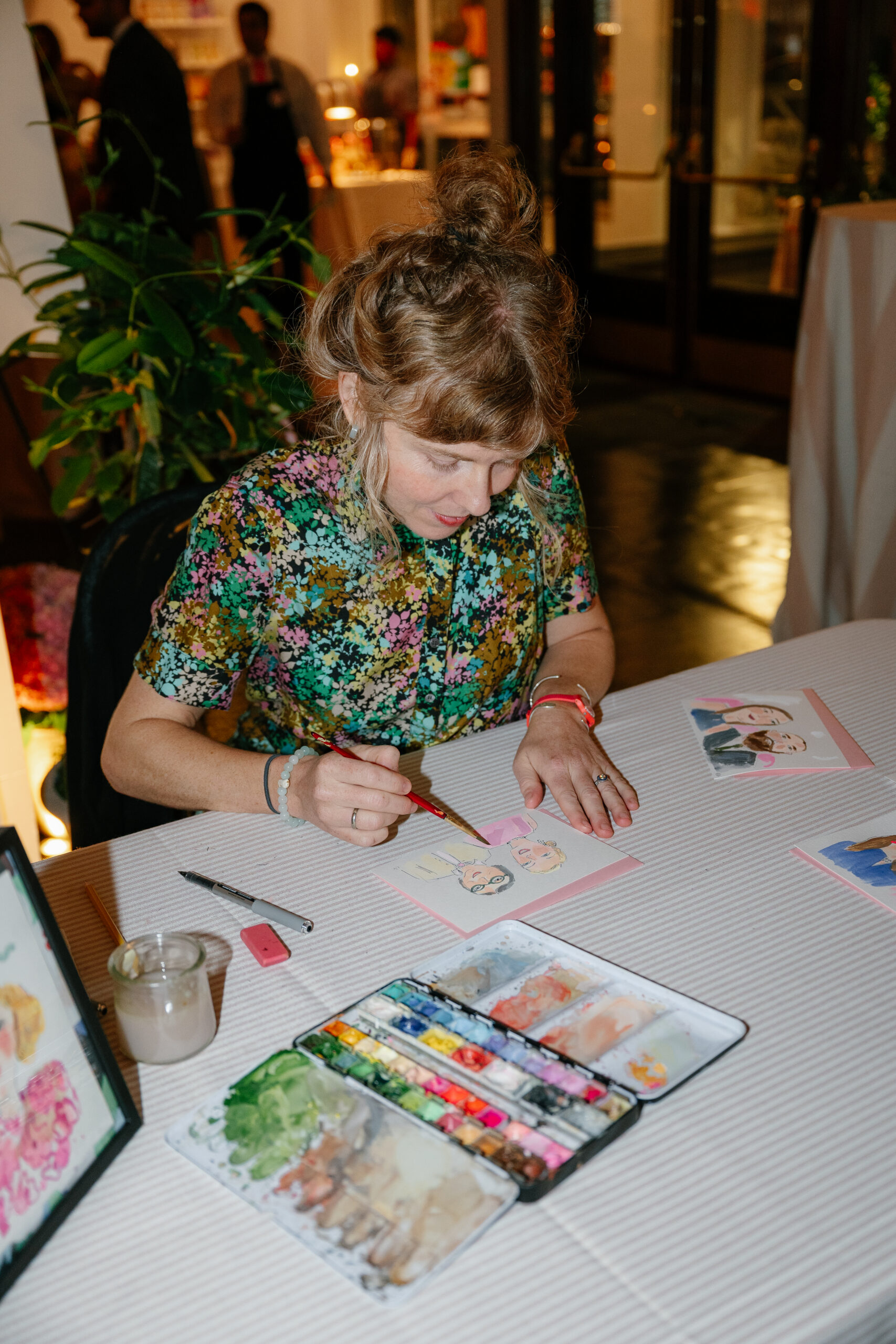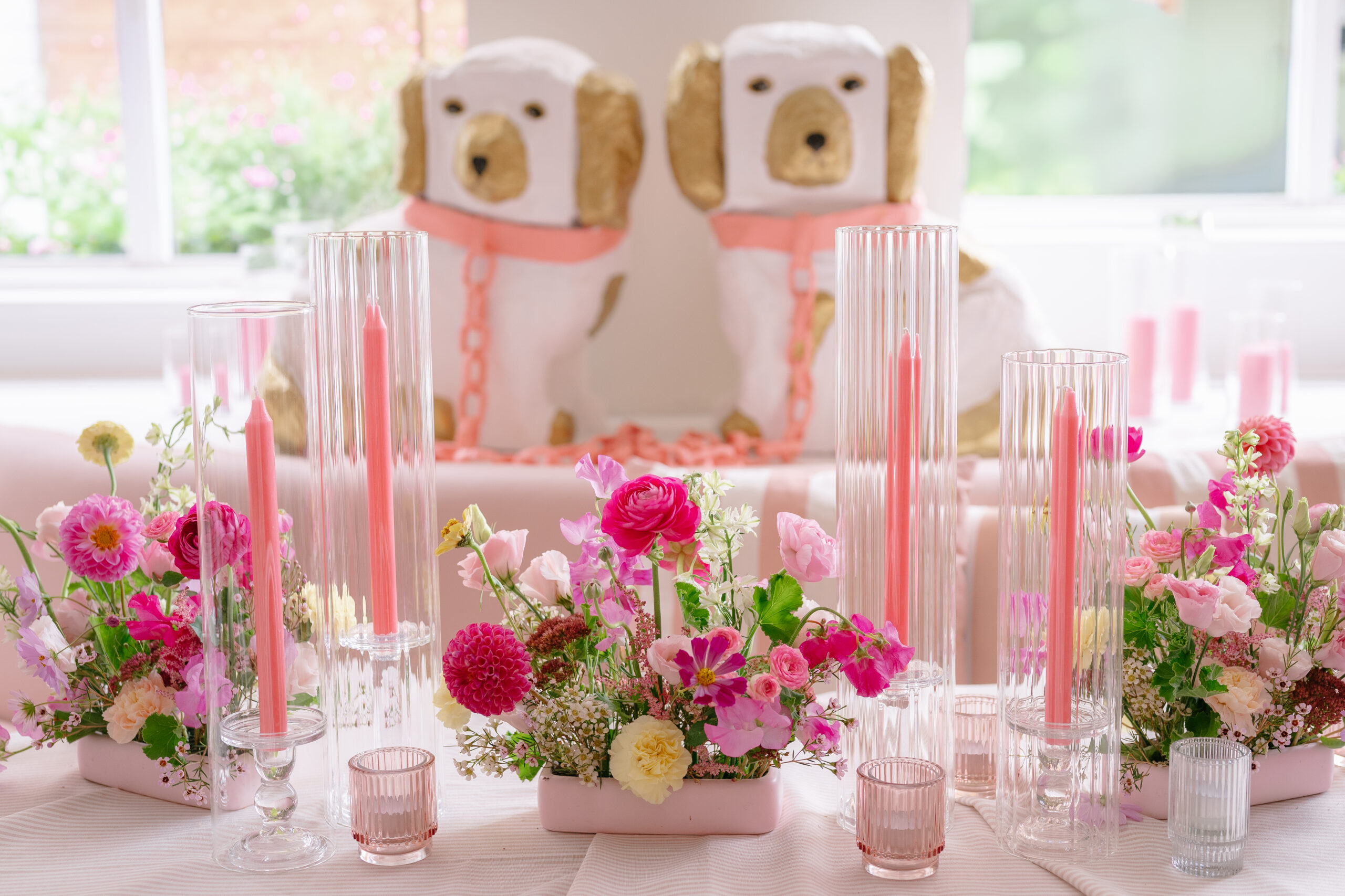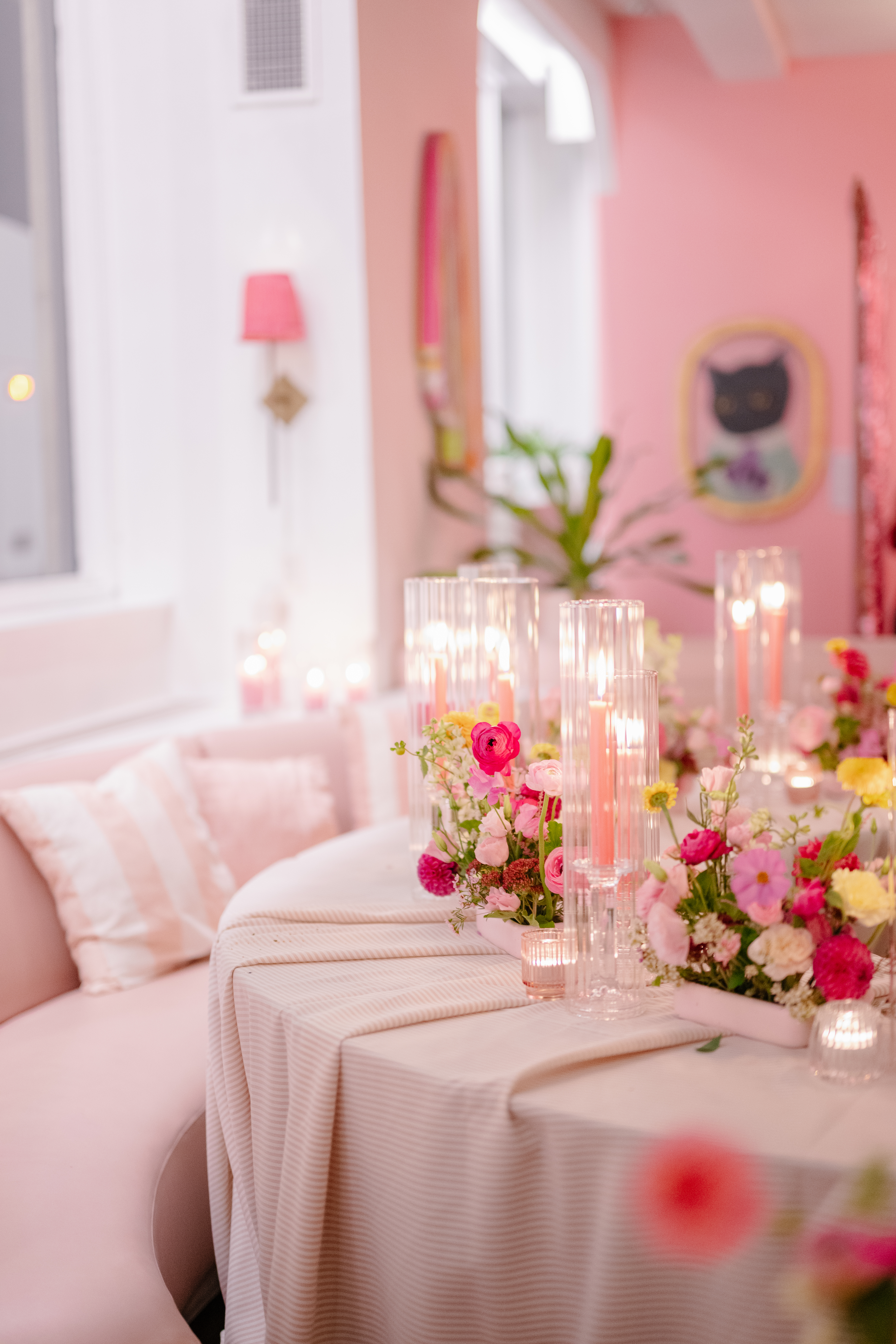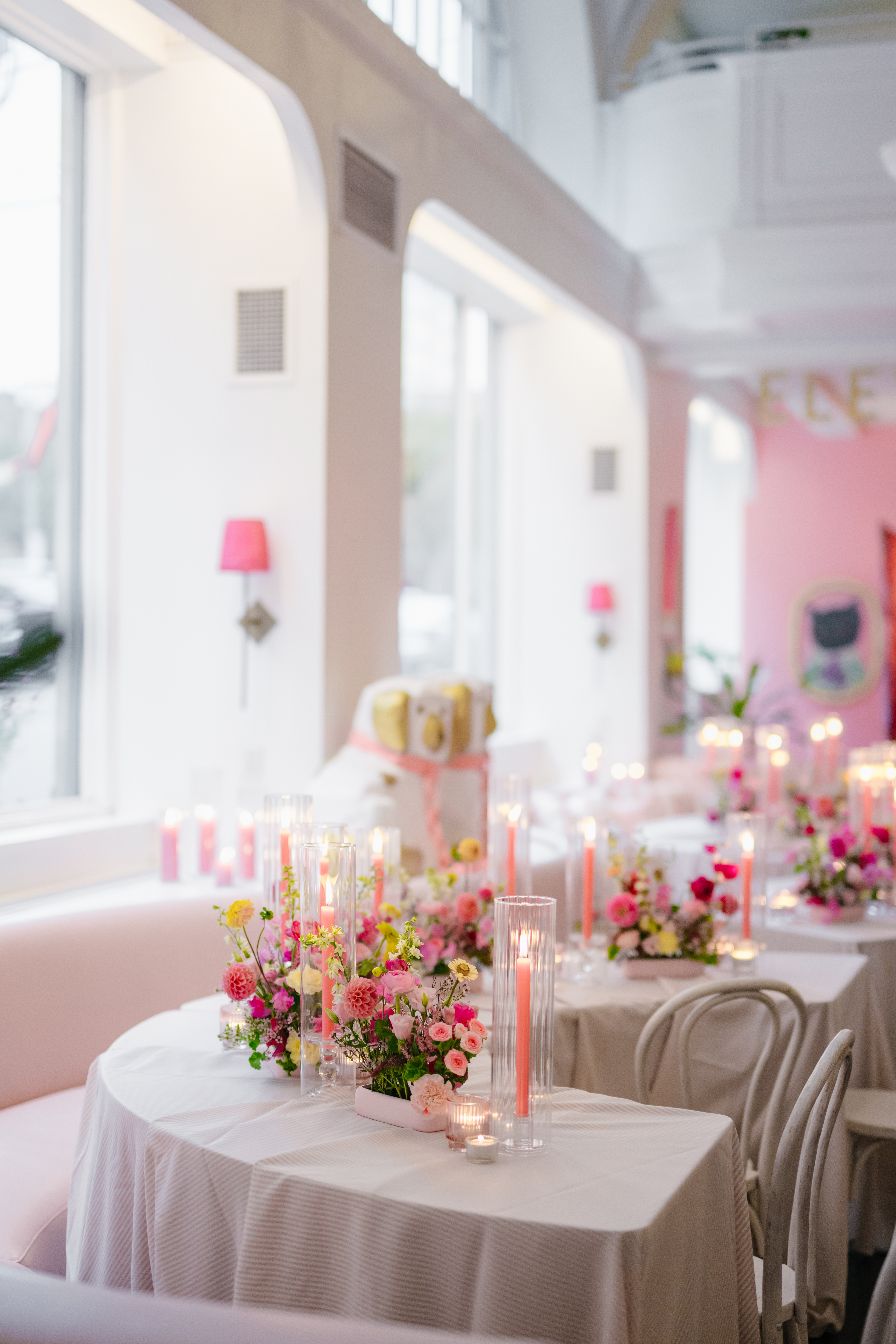 Emma’s vision centered on one priority: fun. From the moment guests stepped into the reception, it was clear this would be a party to remember. A pink striped dance floor set the tone, while thoughtful details, like custom cups featuring Max and Odie, added personality and charm. During cocktail hour, guests were treated to a breathtaking pink sunset on the rooftop, a serendipitous backdrop that felt almost too perfect to plan.