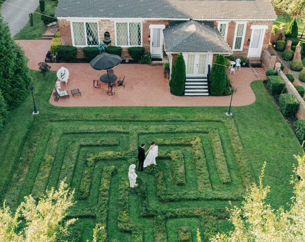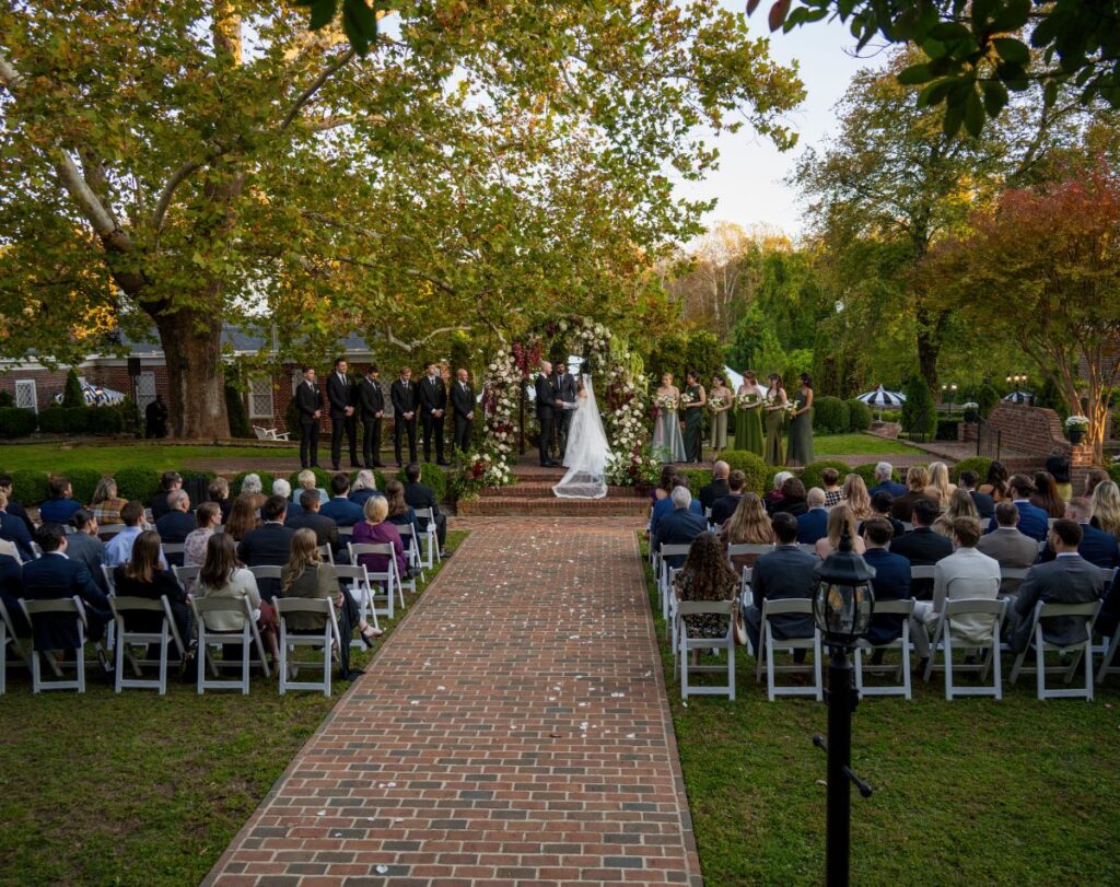 Garden: Imagine walking down the long brick aisle in our English Formal Gardens and up to the intricately designed Ceremony Gazebo under our 100 year old sycamore tree.