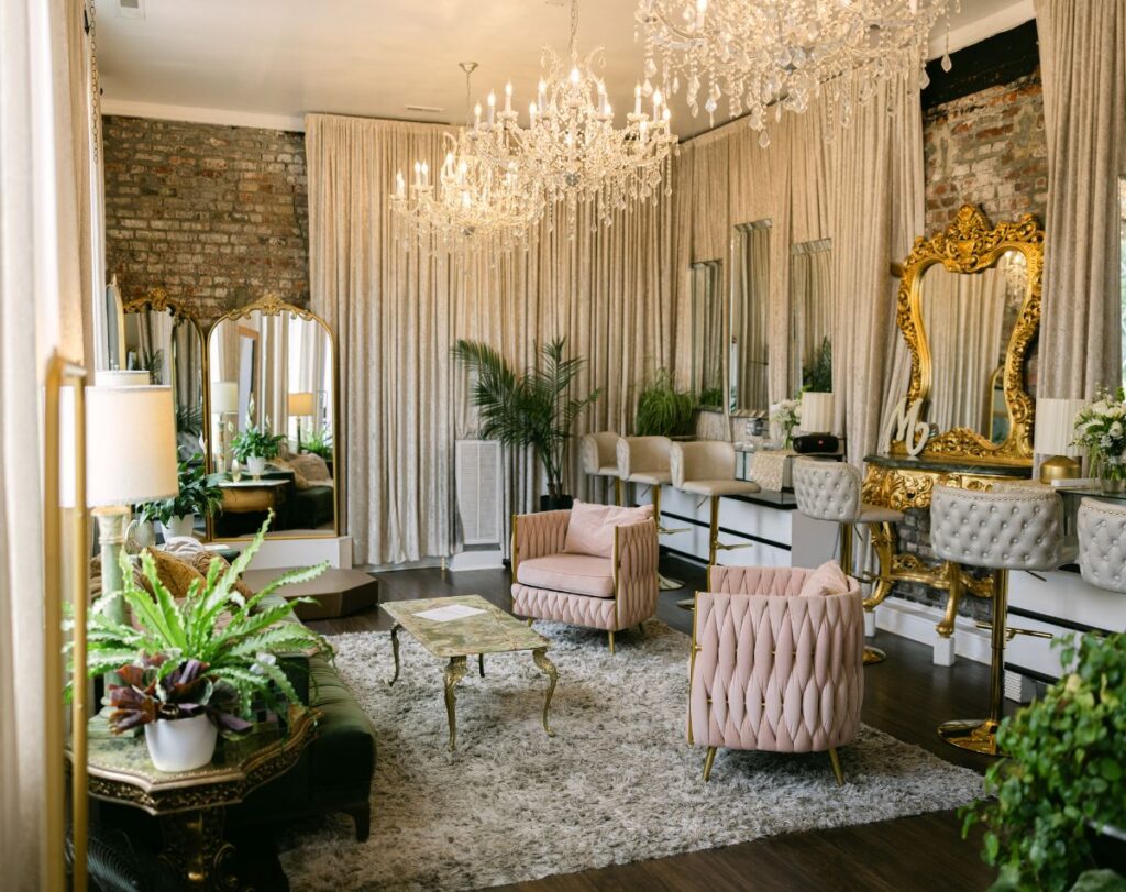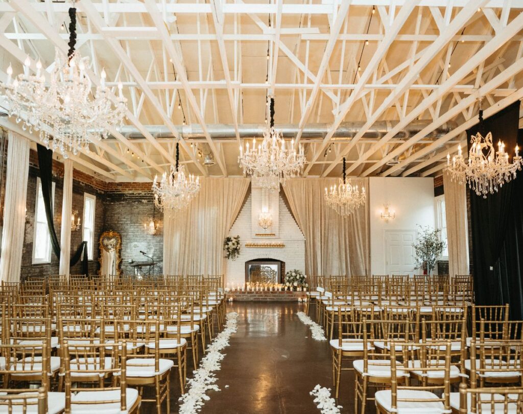 Gallery: Enjoy the picturesque backdrop of our lavish, vintage, European styled Gallery for your Ceremony or Reception. The grand space opens through swoon-worthy European doors and is decorated with opulent chandeliers, ornate mirrors, and lush velvet curtains. The floor to ceiling brick fireplace is the perfect backdrop for your heartfelt vows!